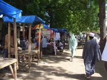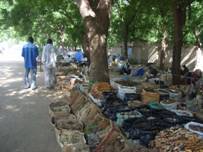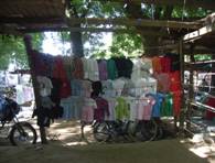 林の中を通りぬけて道に出ると、そこにも店が道に沿って並んでいた。露天が隙間無く続く様子は、まるで縁日のようである。店といってもこれもまた木枠にブルーシートをかけたものだが、先ほどの林の中の店々に比べるとスペースが小さい。だいたい二畳ほどである。扱っている商品は、衣類、布、靴、かばん、鍋など多様である。