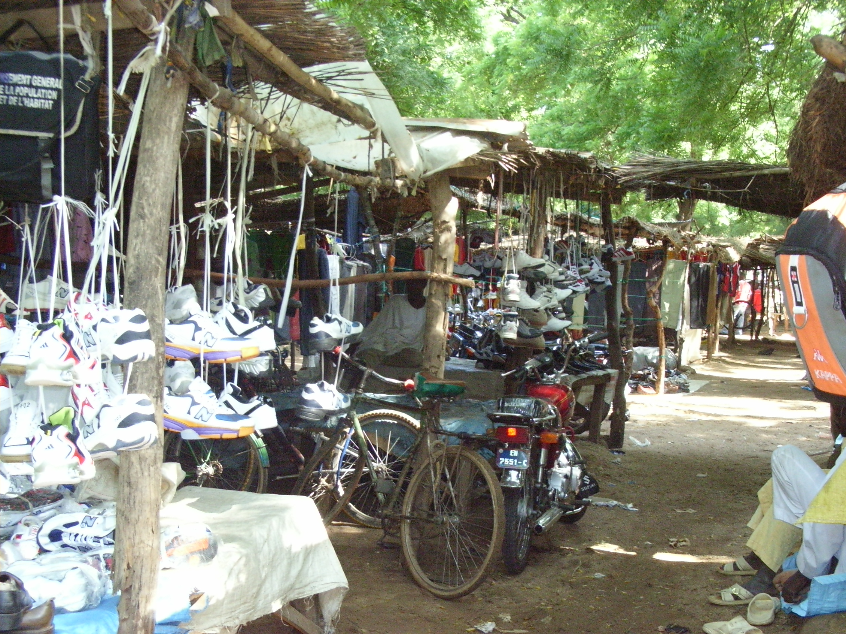 そのそばには、靴店が集積していた。たくさんの靴が、店頭にぶら下げられている。靴の値段は2千CFAである。これは新品の中国製の値段で、同じ靴でもヨーロッパからのものだと、中古でも4千CFAと倍の値段になる。