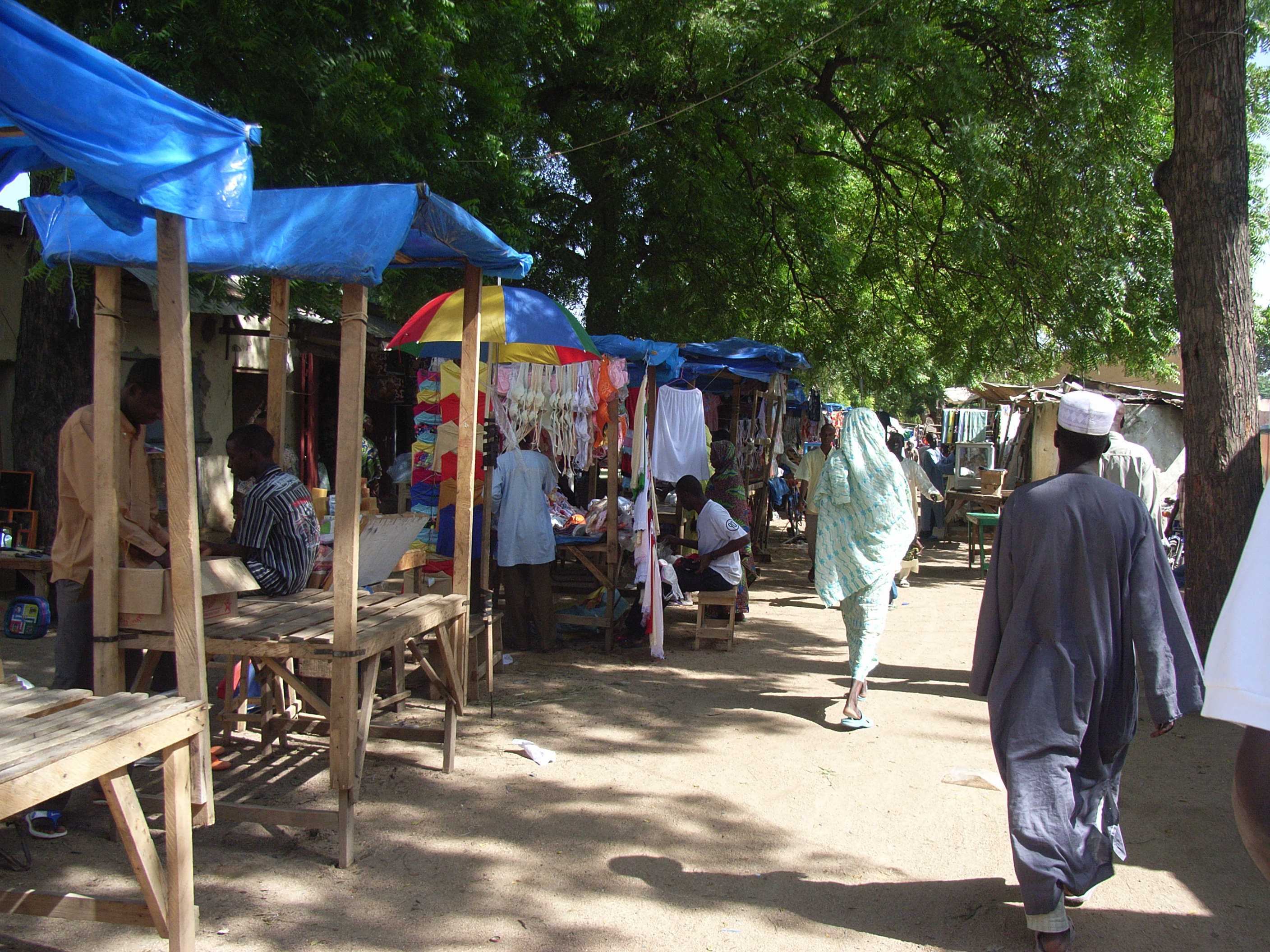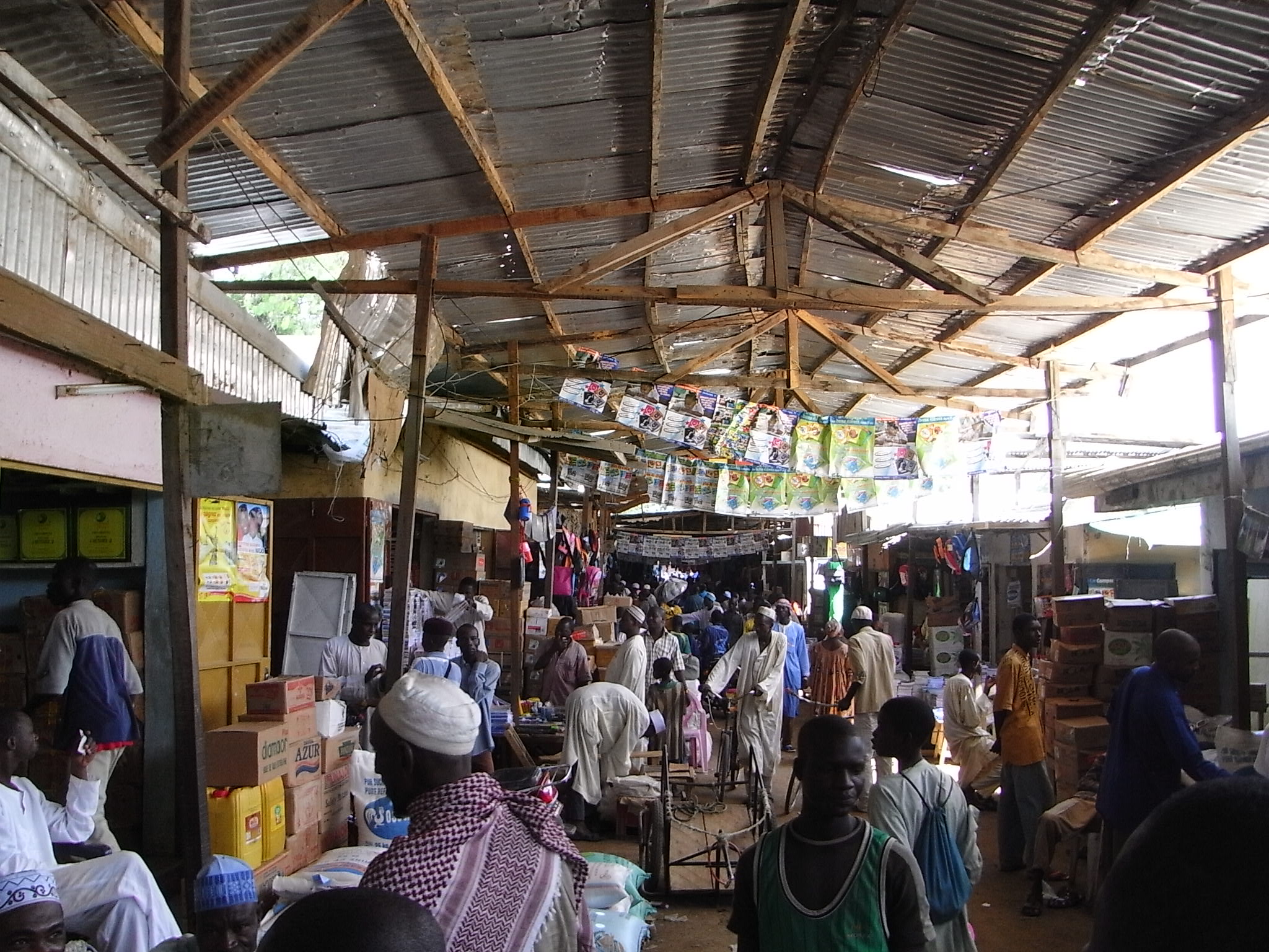 労働集約的な工業製品は中国製が多い。実際、衣料品やボールペンなどは中国製であった。また石けん、ボディーミルクなどの日用品はナイジェリア産や国内産のものが多い。他にも整髪料などはイタリア製、イラン製、UAE(アラブ首長国連邦)製といった多様な場所からの輸入品であった。米は地元産のものと、タイ、インド、ベトナム産などがある。輸入品の方が価格は安いという。ソルガム(モロコシ)は地元産のものだが、袋にはマイドゥグリ(Maiduguri)とナイジェリアの地名が書かれていた。