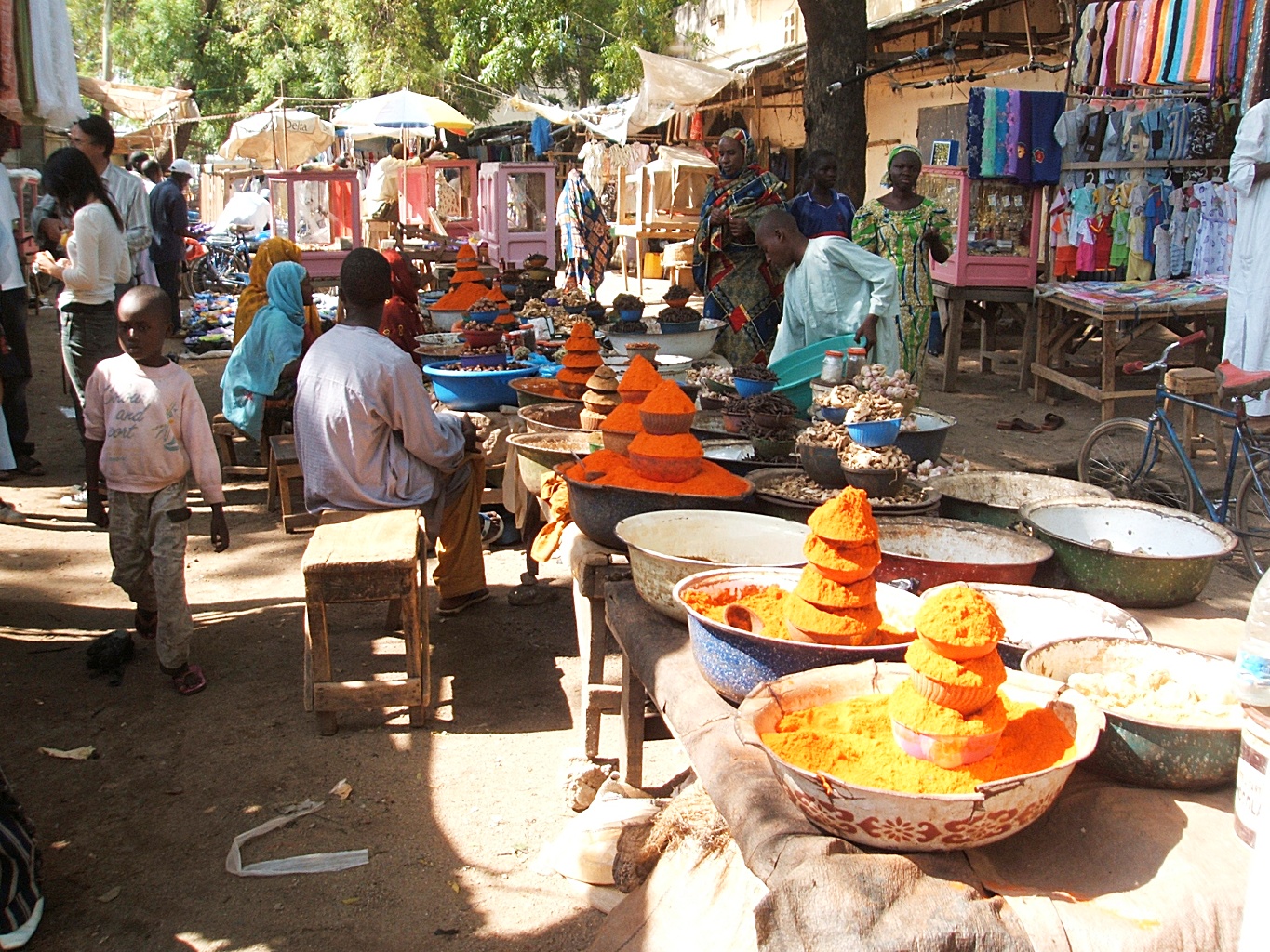 道幅が広いところでは、道の真ん中に木の机といすが置かれ、その上に皿がたくさんあって、鮮やかなオレンジ色や茶色の香辛料が盛ってある。道の両脇には、トタン屋根の固定の店舗も見られた。