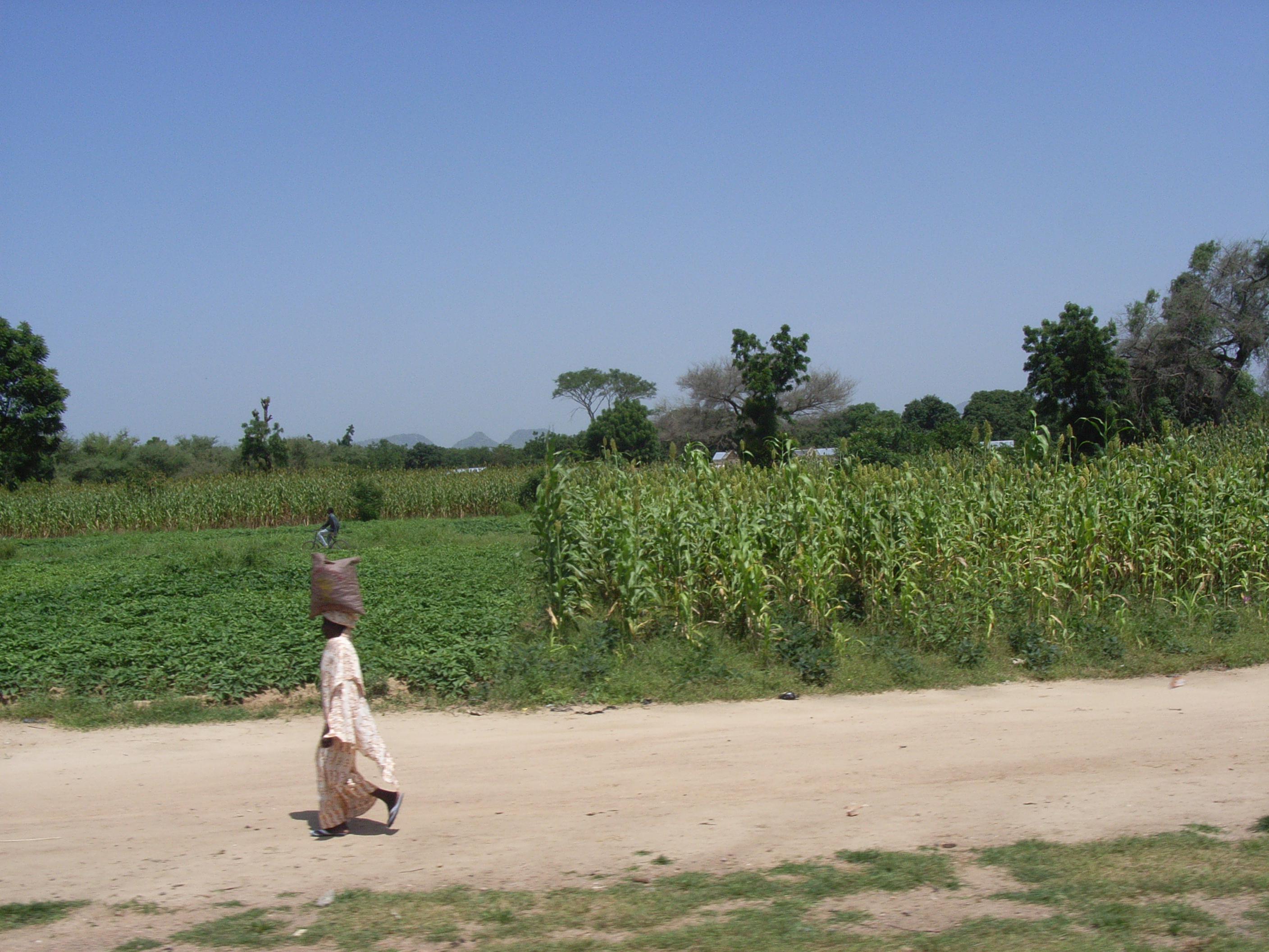 市場から離れると、辺りはすぐにサバンナが一面に広がる景色に変わる。背の高いソルガムがたくさん植わっている畑が車窓から見える。樹木の背丈は低く、ぽつんぽつんと草原の中に現れる程度である。現在は9月で、雨期の終わりにあたる。この時期にソルガムを植え、1月に収穫するという。