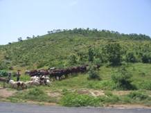 ときどき、道の横には大量の牛と、それを追う牛飼いが見られる。家畜にはヤギやロバもいて、道の近くで草をはんでいる。