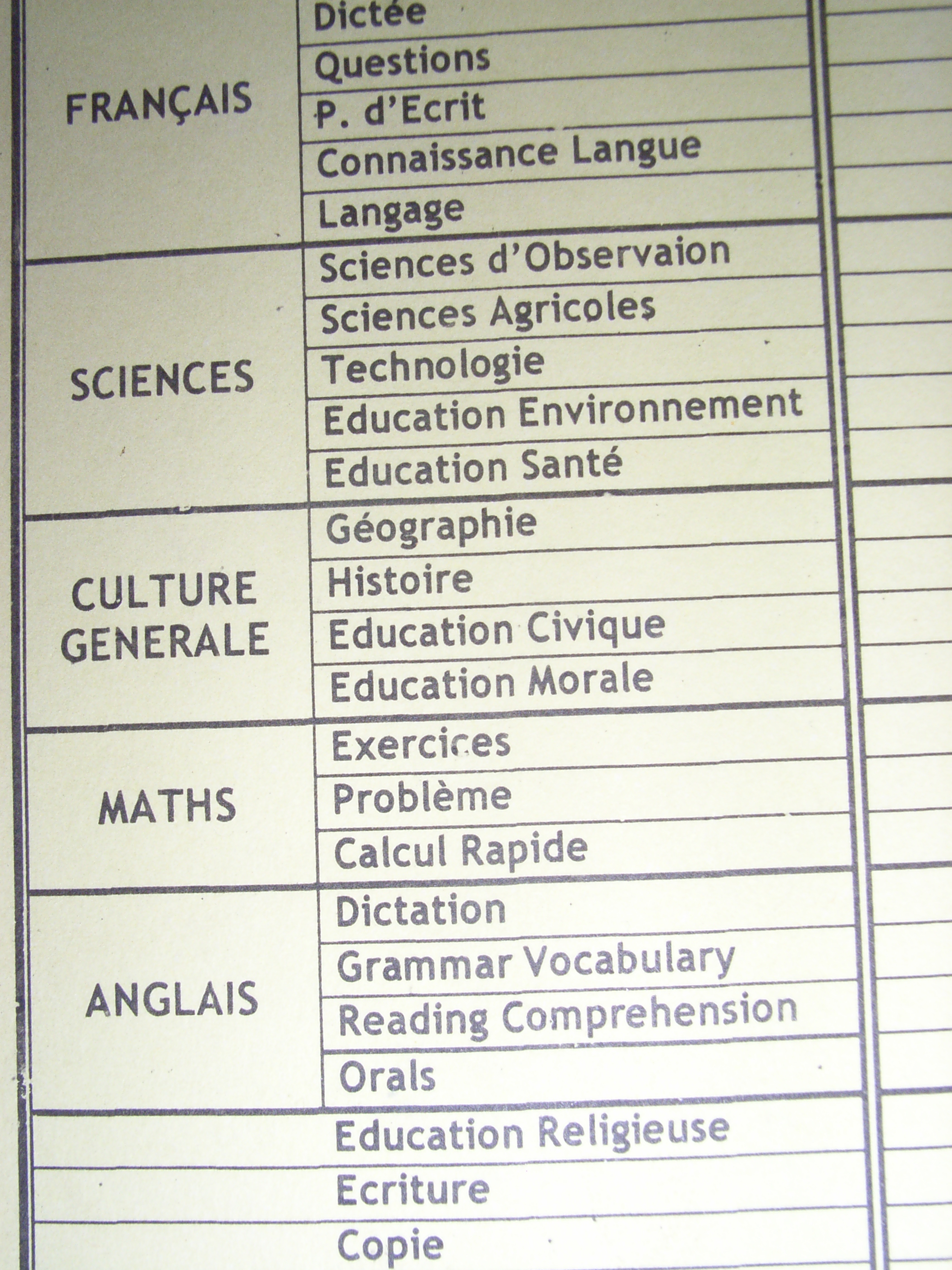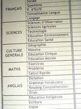 それぞれの学年は1クラスずつであるが、6年生はAとBの男女別の二つに分かれている。教えている科目は12科目ある。主要教科はフランス語、英語、数学、理科、社会の5教科であり、その他は、美術、体育、音楽、技術・家庭、宗教、書き取り(2コマ)となっている。公立の学校のカリキュラムにはなく、日本のODAによる援助でしか行われていない、美術・音楽のような「情操教育」に分類されるような教科も、私立の学校では取り入れられていることがわかり、興味深かった。授業は、小学校1年生からすべてフランス語を使って行われている。