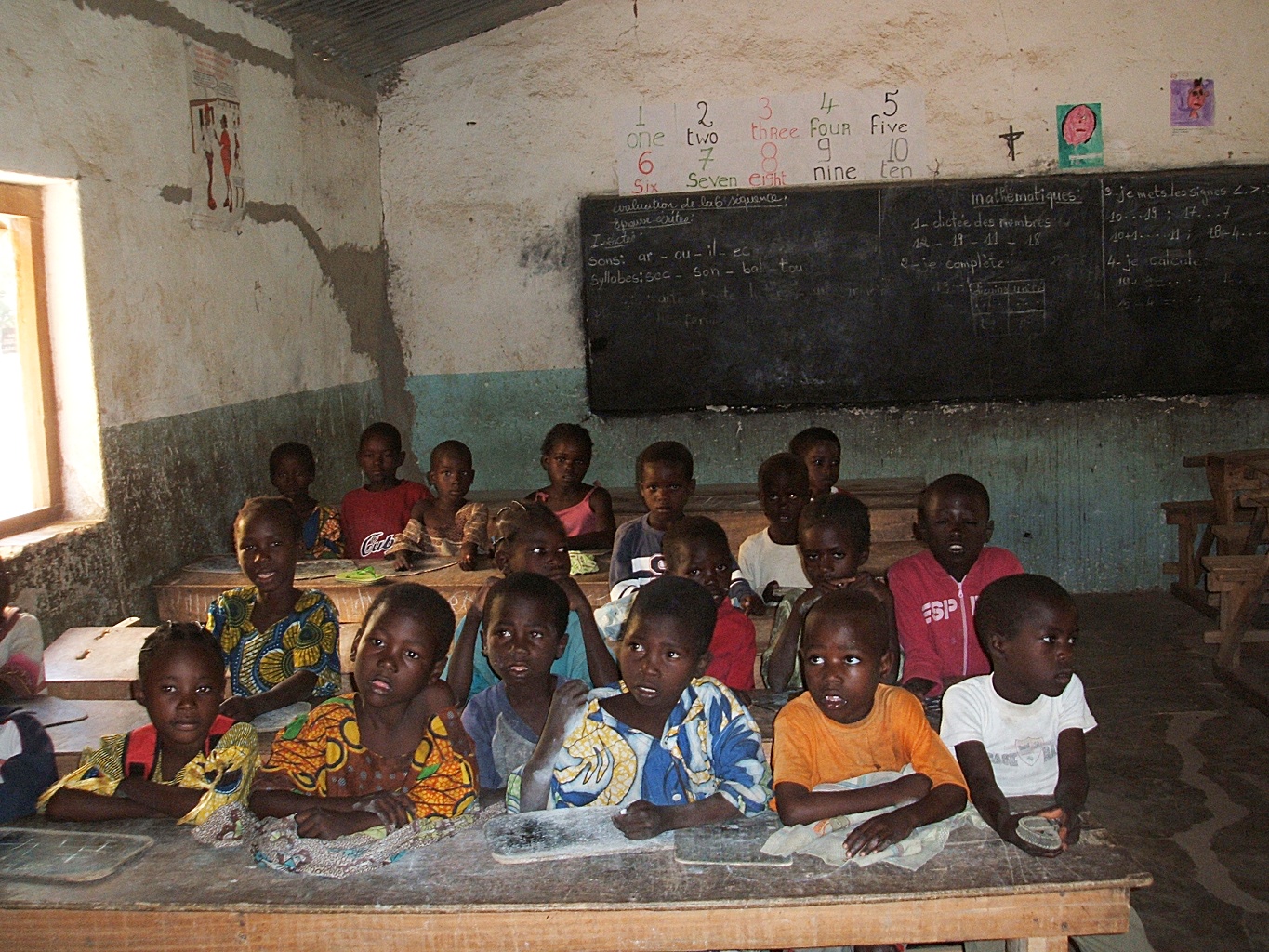 2年生のクラスにお邪魔した。先生に促されて児童たちが英語であいさつをする。突然の来訪者に驚いたのか、皆おとなしくしている。ちょうど地理の授業中のようであった。子供達は紙のノートを持っていない。代わりに、小さな黒板をそれぞれ持っていて、チョークでそれに筆記する。ざっと見渡したところ20人ほどいるように見える。教室の大きさは日本の学校と同じくらいで、長机と長椅子のセットが5列×2つある。教室の前後には黒板があって、正面の黒板の上には“1 un 2 deux 3 trois ”とフランス語が書かれた紙が貼ってある。その横には道具入れが設置してあり、教材と思われる本やプリント類がきれいに置かれていた。