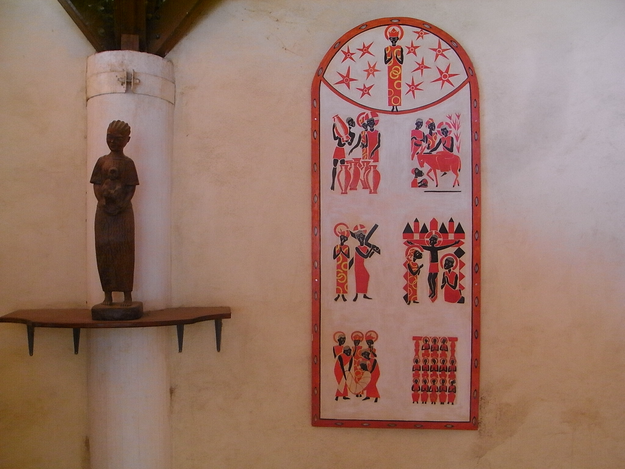 入り口付近の半円に囲まれたスペースには、聖書の内容が、登場人物を黒人にして描かれていた。このような描かれ方から、ヤウンデの教会同様、キリスト教の土着化が図られている様子がわかる。