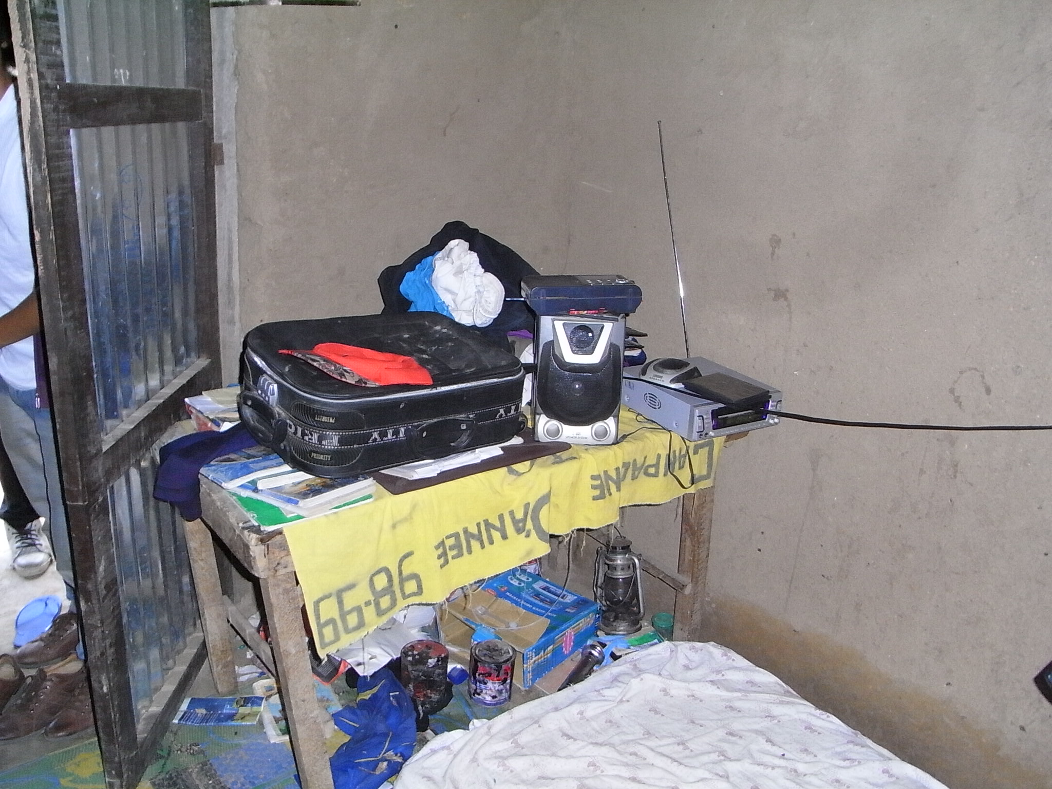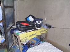 ジャノエルさんの部屋の中を見せていただいた。室内には小さな机があって、その上にはラジオやCDプレーヤーなどが置いてある。農村の電化とともに、これらの品々が、大衆消費財として一般の農家にも普及してきていることが分かる。床には布団が敷いてあった。ドアはトタン製である。一応、鍵もついている。ドアの近くにはカメが置いてあってその中に水がたまっている。飲料用かと思って質問したところ、雨水をためて生活用水にしているという。