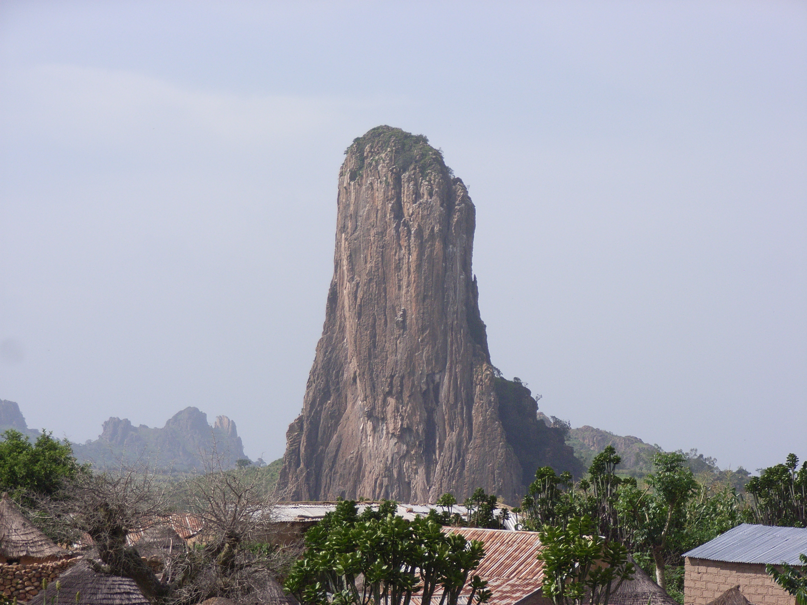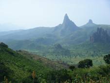 サバンナの広がりの中に、垂直に突き出した岩が目立つようになってきた。これが仏文学者、アンドレ・ジードが絶賛したという有名なルムシキの景勝だ。拓けた眼前に突如として岩がそびえている様は、奇怪であると同時に神秘的である。先端が尖ったものや頂上部分が平らになったものもある。そのそれぞれが独立していているため、存在感が際だつ。マンダラ山地はもともと火山帯で、溶岩が残ってこのような神秘的な景勝を生み出したという。この中でもっとも高い山は標高1150mで、現地の言葉で“Zivi”と呼ぶそうだ。ナイジェリアとの国境はすぐそばで、途中の高い地点から岩の切れ目の遙か下の方に、ナイジェリアの平原が広がるのを臨むことができた。