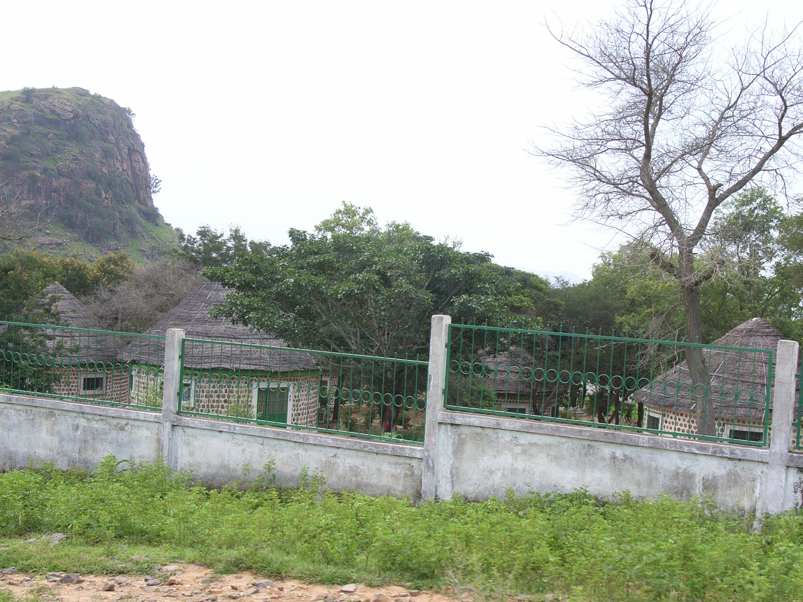私たちが車を止めたところで目についたのは、円錐状に屋根を葺いてある円柱状の建物が立ち並ぶホテルであった。私たちのマルアのホテルと同じで、これまで観察してきた農村の建物を模した、バンガローのような部屋である。しかしながら、壁は土で作ったレンガではなく遙かにしっかりした造りで、白と茶色にきれいに塗り分けられている。建物群の周りは白い塀と緑の柵に囲まれている。入り口には“Campement de Rhumsiki”とかかれ、その下におじいさんが木の棒を持って座っている。一応、門番であるようだ。