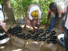 客引きに熱心な子供たちを従えたまま、私たちは道を進んでいった。道の途中に、黒い陶器が並べられていた。地元で作った食器用のもので、実際に手に取ってみたら軽くてかなり堅い。品質は良いものであることがわかる。これも販売用であるが、必ずしも観光客向けのものではないようだ。同じ所に土で作った人形が売られていたが、それは1300CFAであった。一般の農家を通り過ぎたが、そこには黒魔術ができる占い師のおじいさんがいるという。ここでは誰も試さなかったが、このおじいさんは外国から来た観光客を相手にすることもあるのだろう。
