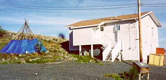 デーネ居留地の家々は、いずれも白く塗られ、きれいな外観だ。これは、例の議事堂の開会式にエリザベス女王がイエローナイフを訪れた際に、デーネの居留地も視察されることになったために、外観を改装し直したそうだ。また、政府の補助金を受けて、古い住宅を改築して大きな新しい住宅を立てている最中だそうで、古い住宅が取り壊された空き地も見られた。