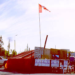 次に、市街地の近くの金鉱 Con Mine (miramar mining 所有)を訪れた。イエローナイフの主要産業のひとつが、金採掘である。ジャイアントマインと呼ばれる金鉱が最も大きく、他に2つの金鉱で採掘が行なわれている。そのうちの1つがこれである。ところが、労働組合がストライキを決行中で、ゲート脇にピケを張っていた。ピケのテントにいる労働者に声をかけてみた。その話によると、金の市場価格が下落したため生産の規模が縮小され、それにともない会社側が賃金カットしようとしたこと、先任順位権seniority rights(解雇や一時帰休を、勤続年数が短い労働者から行い、勤続年数の長い労働者の雇用は守られる優先権)を無視した雇用方針に対して、98年5月よりストを行っているという。彼らは全米加の鉄鋼労働者組合802支部に属し、組合本部から1人あたり週300ドルの支援金を受けている。これを生活資金にストライキを継続しているのだ(通常の給料は、週に1,000から1,200ドル)。ストライキ中の労働者の中には、かつてブリティッシュコロンビアで坑夫をしていた人もいた。職能別労働組合制をとっているので、一旦労働組合に加入すると、合衆国とカナダの鉱山で自由に労働することができる権利を獲得する。一般には、鉱山労働のような過酷な肉体労働には、社会的地位のより低い少数民族の労働者が多く従事することがある。また、イヌイットの雇用は、深刻な先住民の失業対策という意味もある。そこで、先住民の労働者はいるのかと質問すると、ほとんどが白人ということであった。職能別労働組合制度に守られた白人労働者と、かつての自らだけが生活した土地の底に埋まった資源であるにもかかわらず、それを採掘する労働力市場にすら自らを売り込むことのできない先住民の対比が印象的であった。